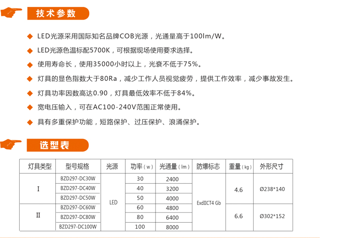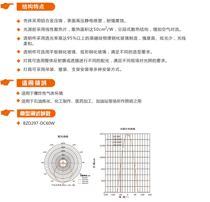 BZD297-DC防爆照明灯壳体采用铝合金压铸,表面高压静电喷塑,耐强腐蚀。光源腔采用线性散热片,散热面积达50cm² W,分段式散热结构,增加空气对流。透明件可选用平板钢化玻璃、弧形钢化玻璃,满足不同的造型要求。...
